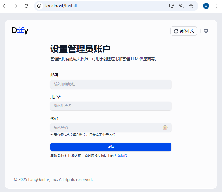 5. 启动 Dify, 打开浏览器, 地址输入:localhost,按指示创建账户。 账户信息与系统和软件无关联,并无相互核证。