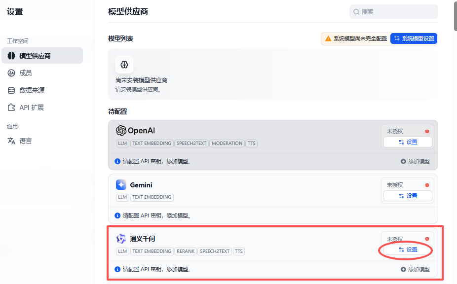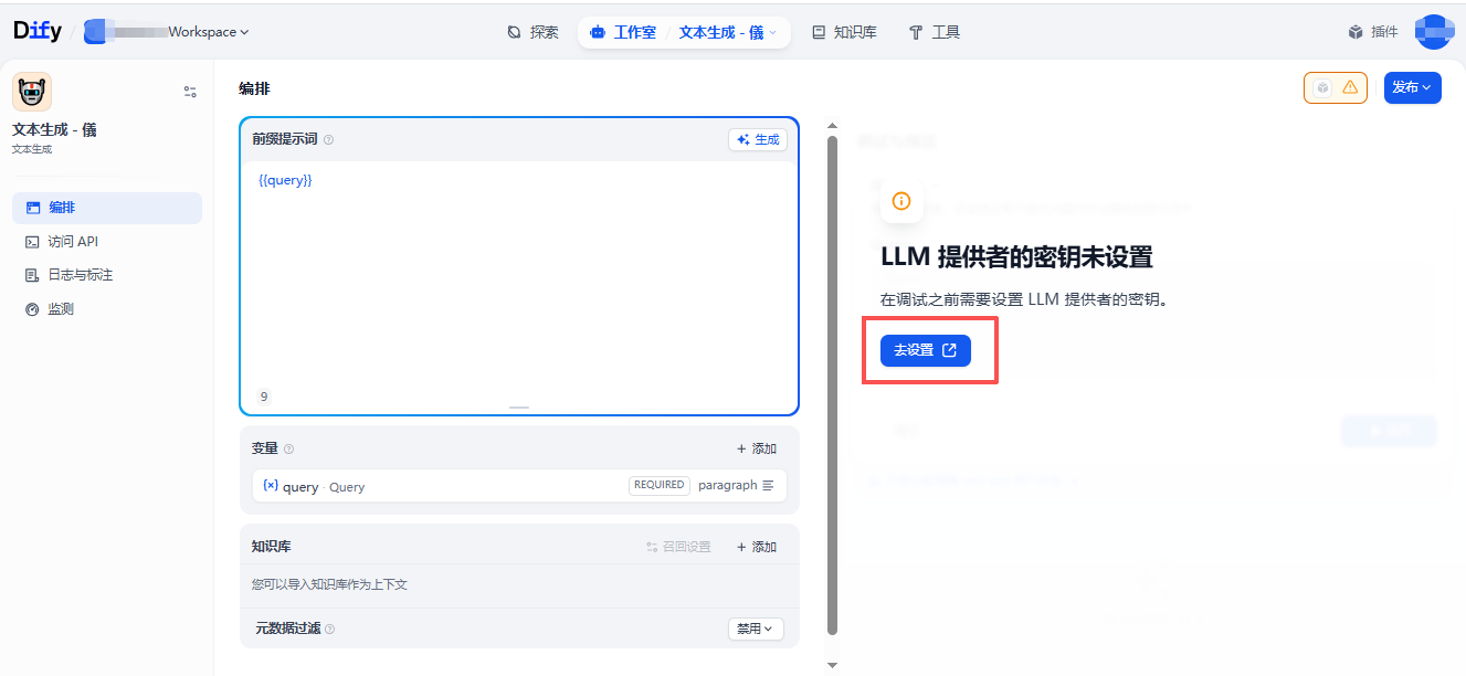 1. 首次使用Dify,提示并未设置模型,点击”去设置“