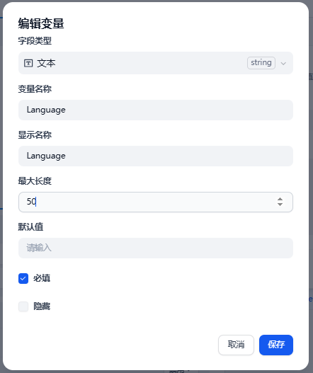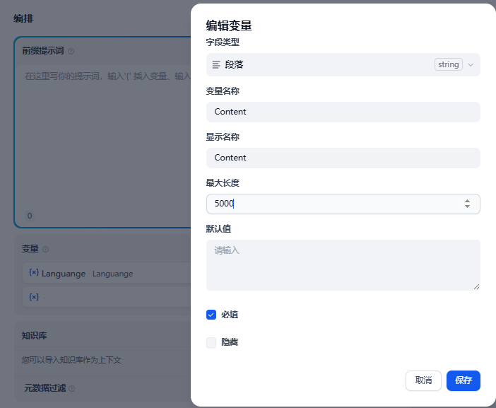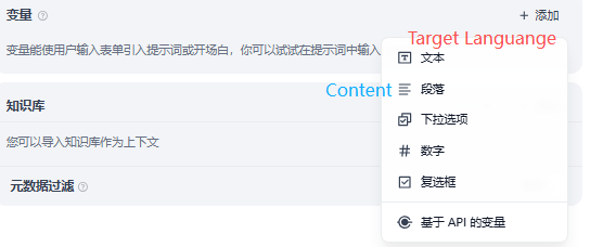 3. 拆分Dify 的输入:目标语言(Target Language),内容(Content)。点击“变量”栏最左边的“+ 添加”,从下拉菜单中,先选择“文本”,点击新的空白定义变量“Target Language" , 再选择”段落“ 定义”Content"