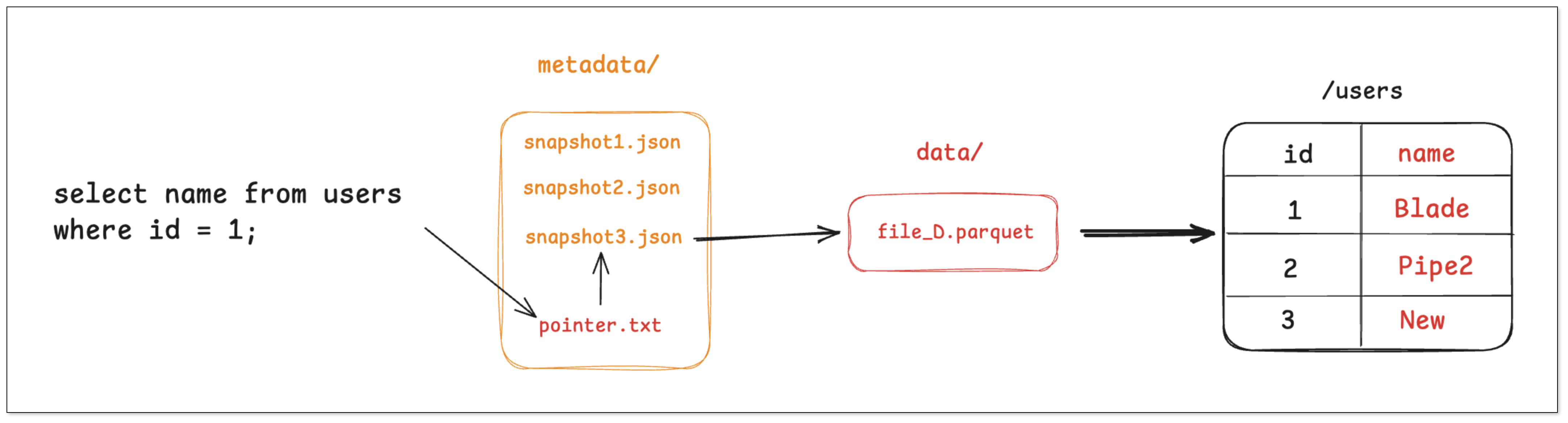 任何查询 users 表的查询请求,都会先找到 pointer.txt,读取 snapshot_1,然后直接去访问 file_A。