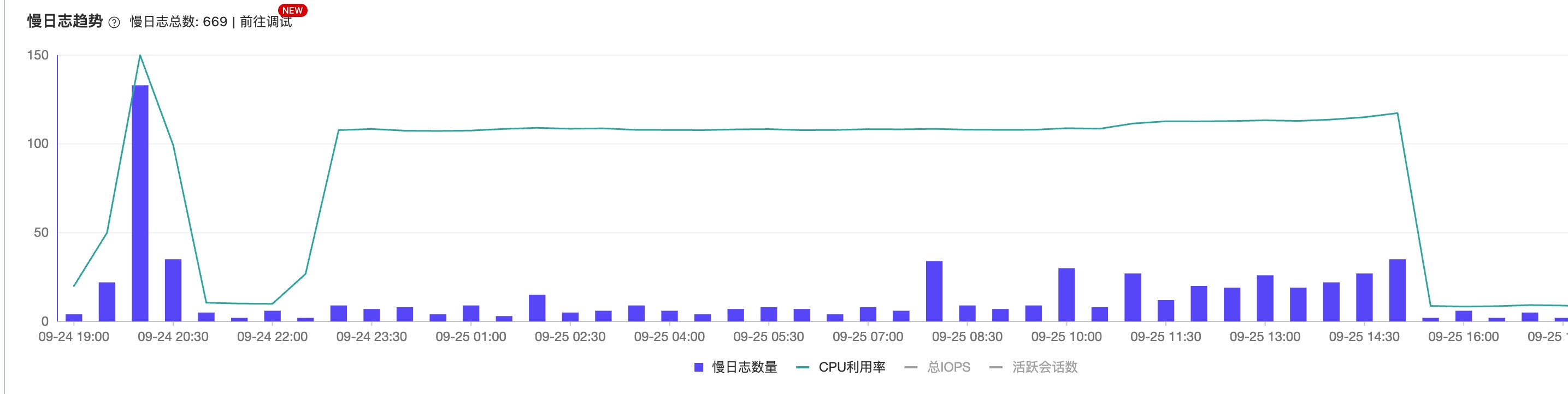 看了下监控,CPU 一直居高不下,直觉上来讲,一般是慢SQL的问题,遂看了下慢SQL分析,查到两个慢SQL。