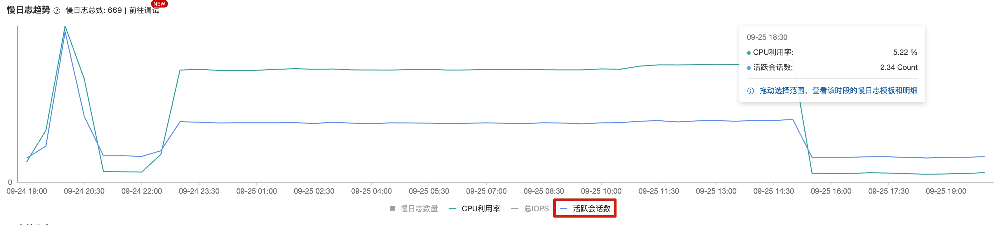 但是这次,我把监控活跃会话的指标点亮之后,发现活跃会话是跟CPU使用率是强相关的。也就是说:之前认为的CPU高是慢查询SQL引起的,这个结论可能这次是错的,也可能是查询会话太多了。