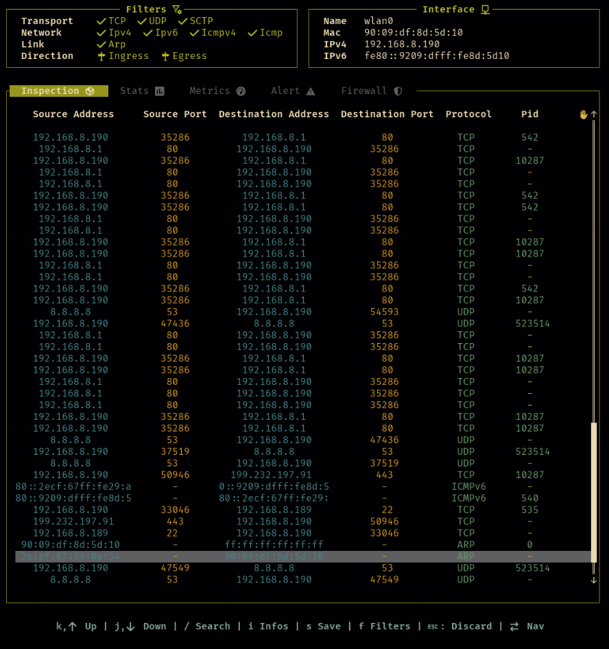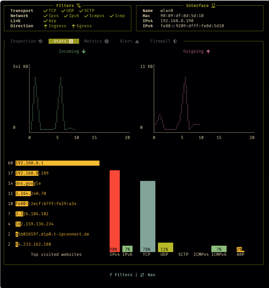 这个工具支持实时的网络流量巡检,并且提供了UI界面可以直观的看到,它还提供了防火墙的功能,捏你也可以直接在UI界面去搜索你想查看的ip或者其他关键字用于过滤流量信息。