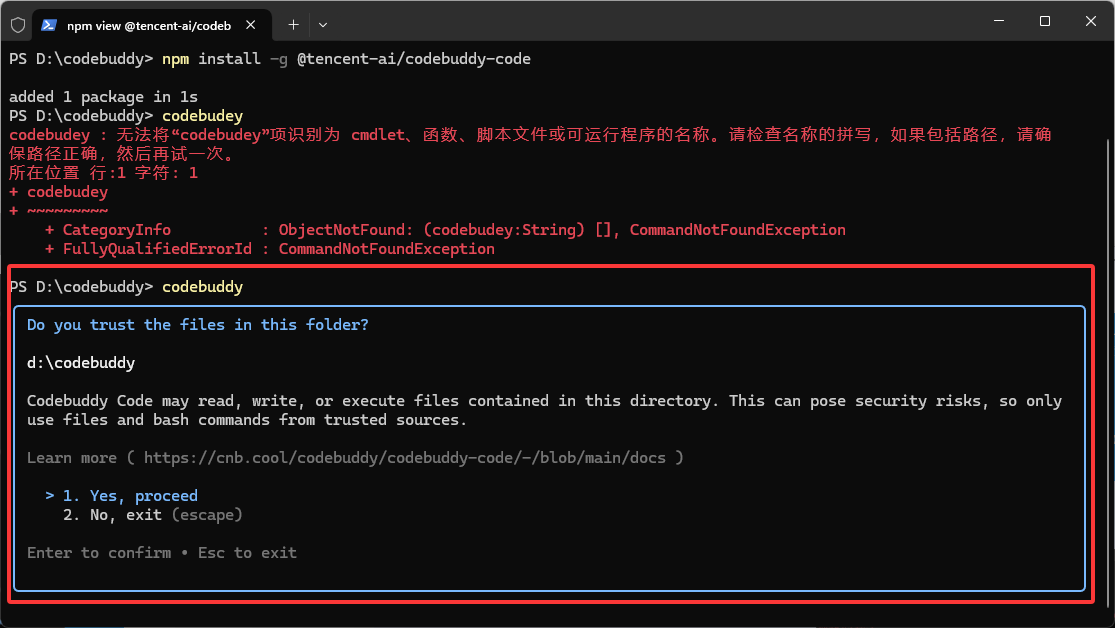 通过npm install -g @tencent-ai/codebuddy-code进行安装
