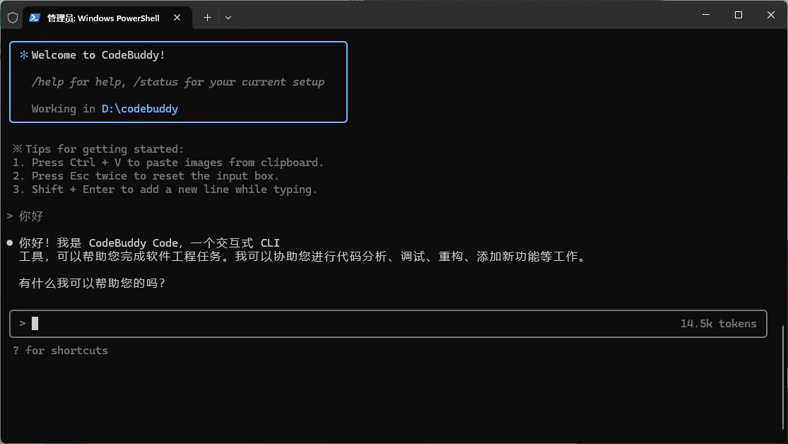 安装完成之后通过codebuddy命令启用