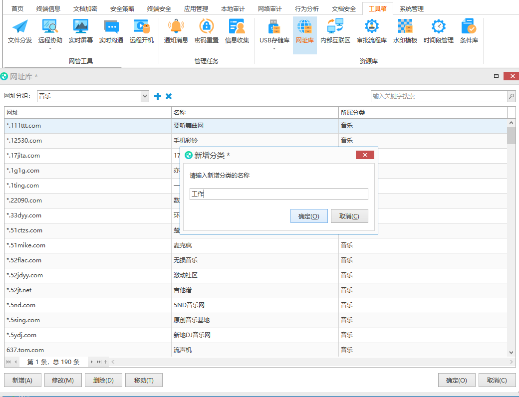 软件的网站白名单功能允许管理员设定一个或者多个被允许访问的网址类型,管理员可以先在网址库中新建一个分类,如工作,然后把允许访问的网址添加进去。
