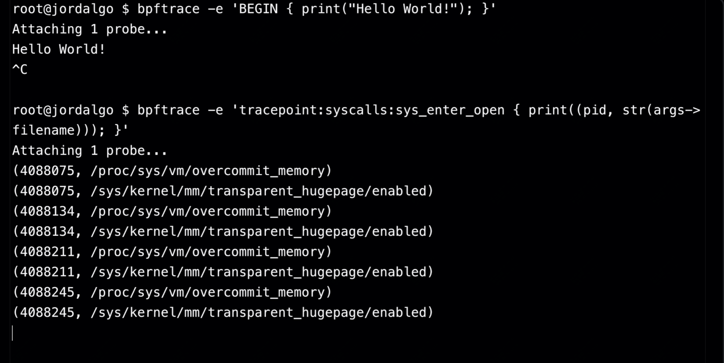 一个更高级的 eBPF 追踪工具,适用于快速构建监测脚本。bpftrace 直接使用 eBPF 运行,无需额外编译。bpftrace 提供直观的统计和直方图,如 hist(args.ret) 生成系统调用返回值的分布图。
