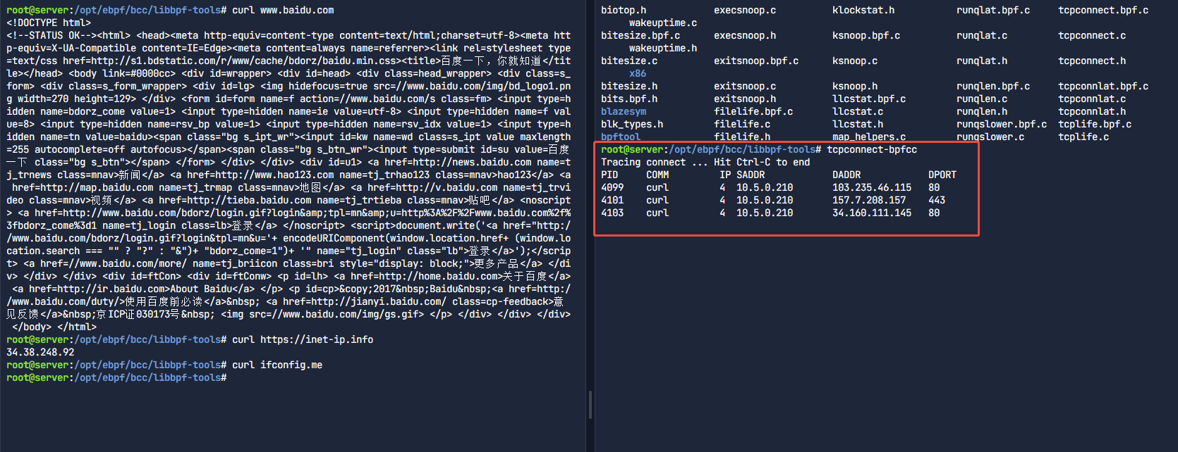 tcpconnect-bpfcc是BCC工具包中的一个 eBPF 追踪工具,它用于主动 TCP 连接跟踪,即监测当前机器发起的 TCP 连接。它会在每次调用 connect() 系统调用时,打印一行信息,包含源地址、目标地址和端口等信息