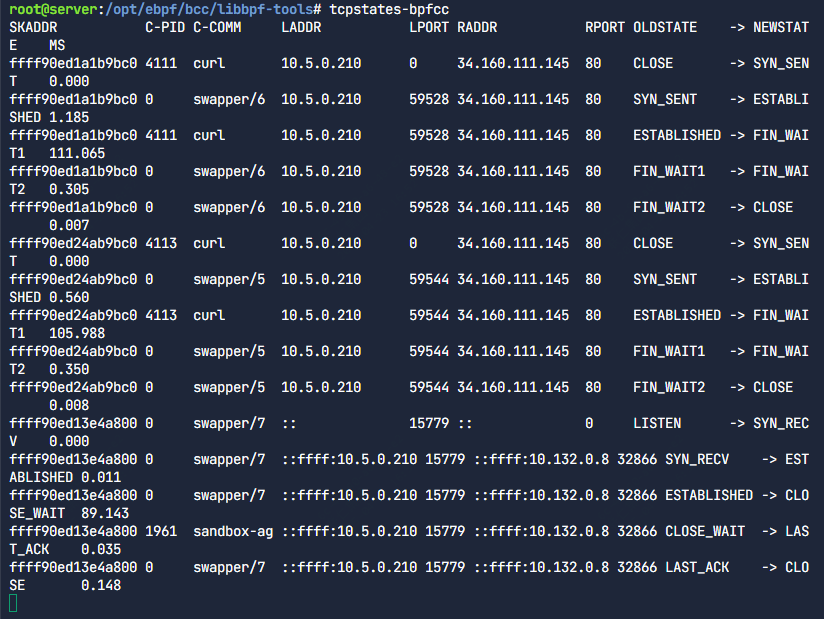 在比如tcpstates-bpfcc可以用于追踪 TCP 连接状态变化