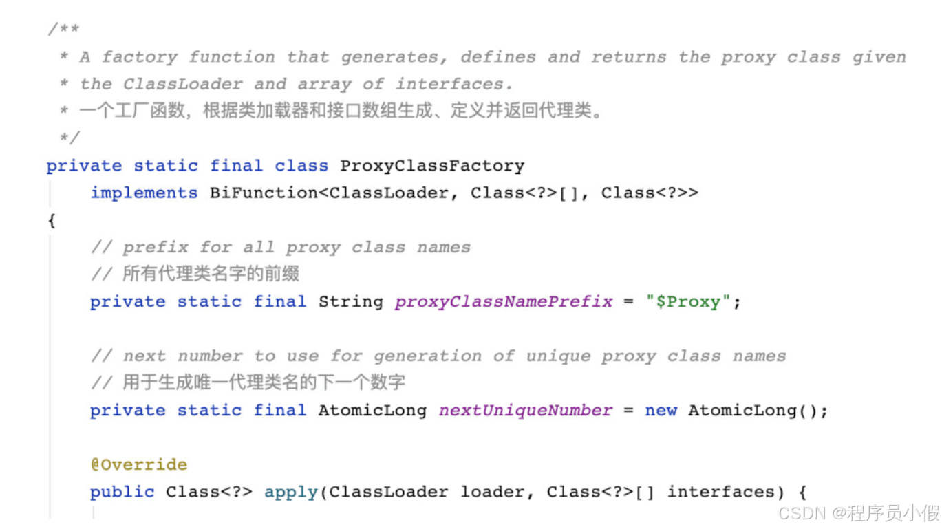 所以代理实例的命名一般是 Proxy1这种。 这个 apply 方法是一个根据接口和类加载器进行代理实例创建的工厂方法,下面是这段代码的核心。