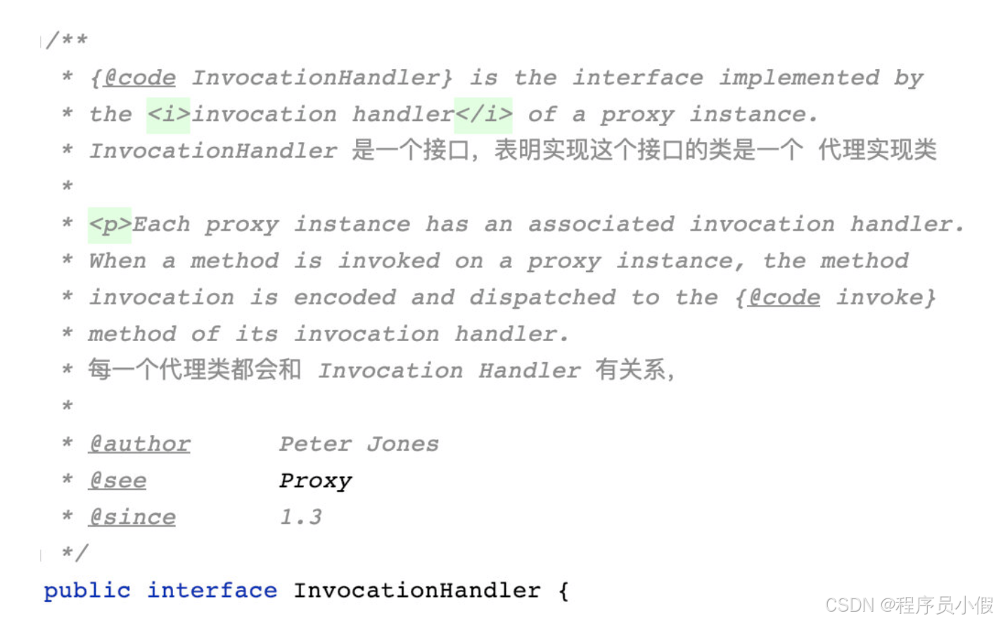 JavaDoc 告诉我们,InvocationHandler 是一个接口,实现这个接口的类就表示该类是一个代理实现类,也就是代理类。