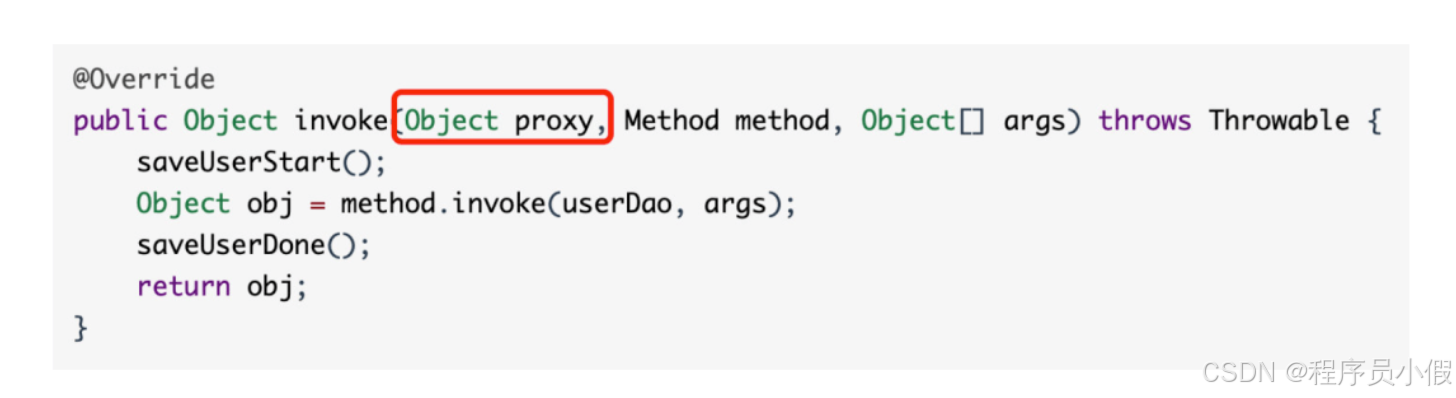 Stackoverflow 给出了一个回答 https://stackoverflow.com/questions/22930195/understanding-proxy-arguments-of-the-invoke-method-of-java-lang-reflect-invoca 什么意思呢? 就是说这个 proxy ,它是真正的代理对象,invoke 方法可以返回调用代理对象方法的返回结果,也可以返回对象的真实代理对象,也就是 $Proxy0,这也是它运行时的类型。 至于为什么不用 this 来代替 proxy,因为实现了 InvocationHandler 的对象中的 this ,指代的还是 InvocationHandler 接口实现类本身,而不是真实的代理对象。