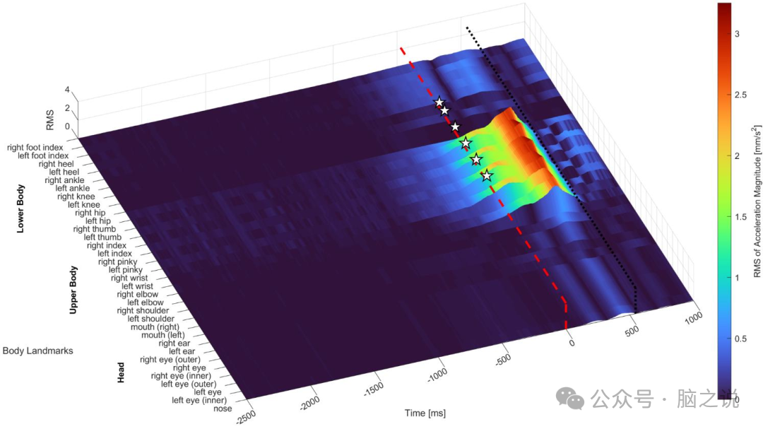 运动起始点检测: 以 PLD 中右手腕 Y 坐标超过右眼 Y 坐标的 “设定点” 为时间参考,通过基线期(-2500ms 至 - 2000ms)加速度均值加 1 个标准差确定阈值,反向计算运动起始时间(定义为 0ms latency)。
