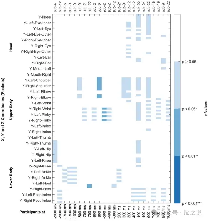 经 FDR 校正后,10 名参与者在不同时间段的身体姿态坐标存在统计学显著差异(p<0.05*),上半身部位姿态差异解释方差最大,如 “右手腕 Y 坐标”“右小指 Y 坐标” 和 “左小指 X 坐标”。成功投篮运动前手腕相对髋部更低,设定点时手腕更高,且成功与失败投篮的设定点出现时间相差约 26ms。