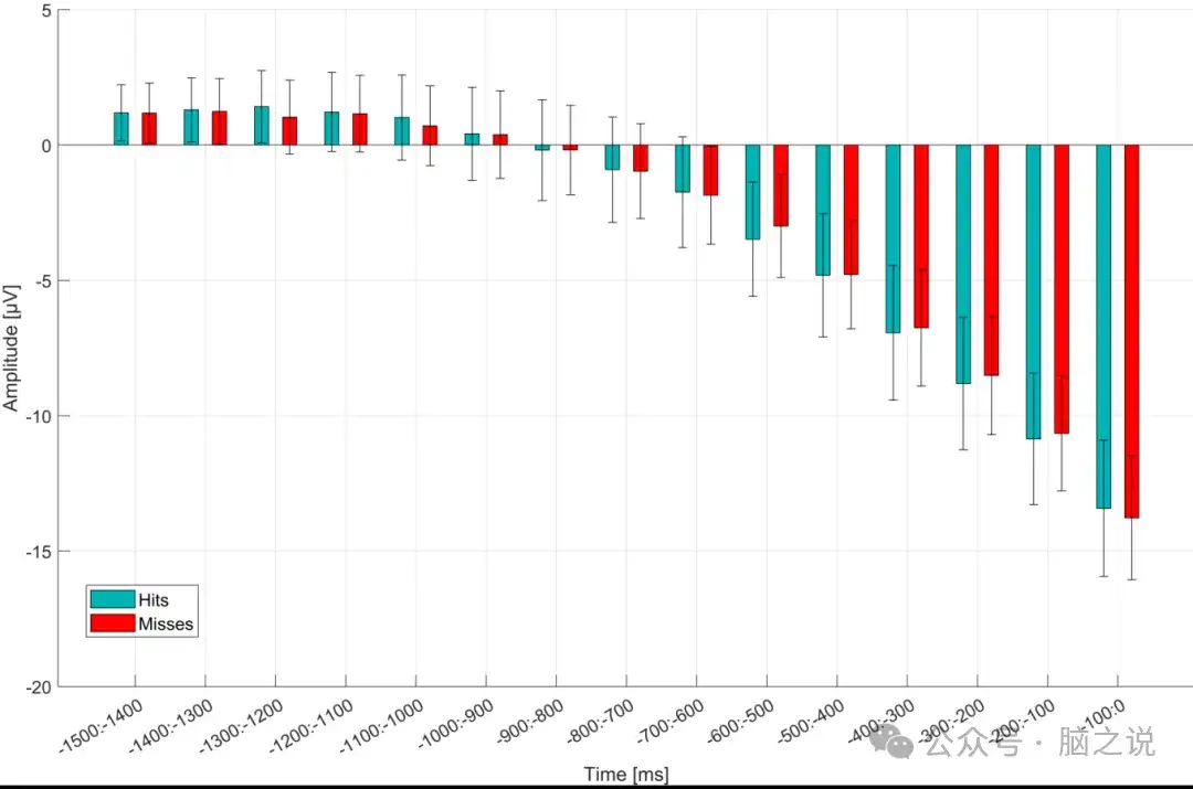 图 5. 不同条件下参与者的事件相关电位(ERP)组平均对比。图中展示了所有参与者在 Cz 通道记录的 ERP 平均振幅,对比了篮球罚球成功(命中)和失败(未命中)两种情况。准备电位(RP)振幅以 100 毫秒为时间窗口,呈现从运动起始前 - 1500 毫秒到 0 毫秒的变化。蓝色柱形代表成功投篮,红色柱形代表失败投篮,误差棒表示每个时间窗口的均值标准误差