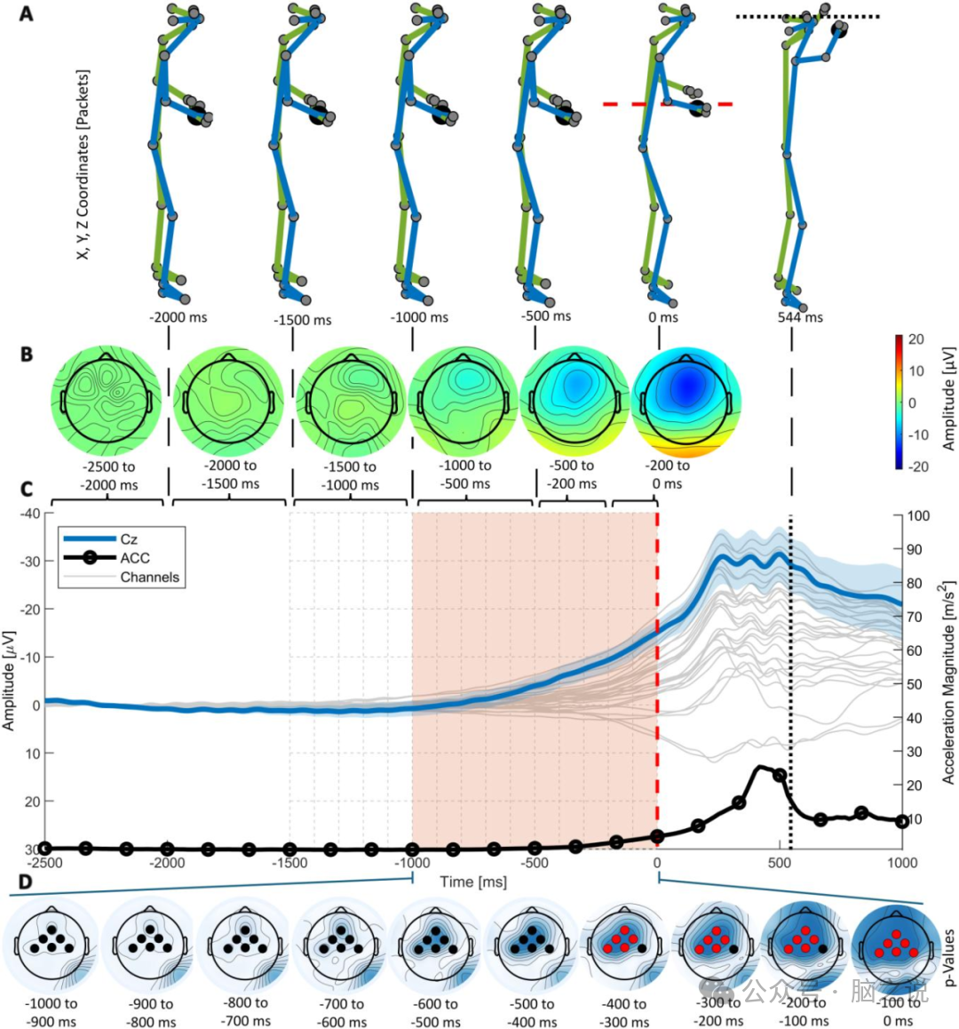 图 4. 人体运动捕捉与事件相关电位(ERP)的联合组平均结果。结合移动 EEG、运动模式和传感器惯性测量单元(IMU)信号,分析任务执行过程中的准备电位(RP)和运动活动