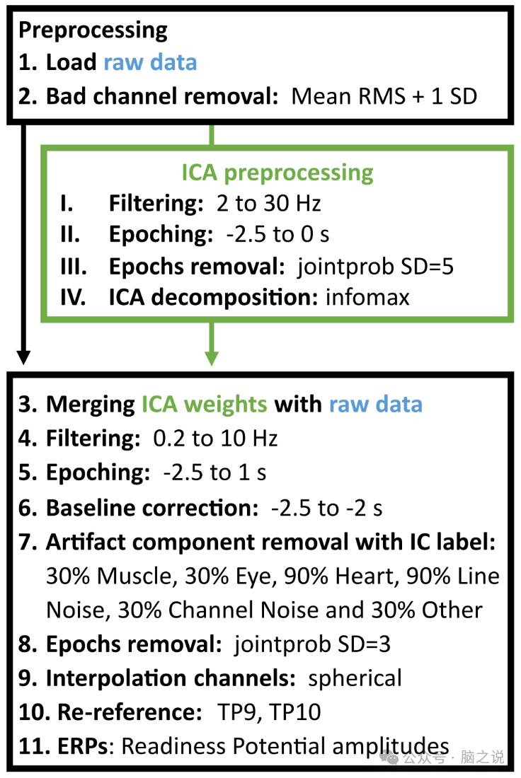 EEG 预处理: 使用 EEGLAB 和 Matlab 脚本处理,包括剔除坏通道、2-30Hz 滤波、 epoch 划分(-2.5 至 0 秒)、ICA 分解、0.2-10Hz 滤波、基线校正(-2.5 至 - 2 秒)、基于 ICLabel 剔除 artifact 成分、剩余 artifact epoch 剔除、球面插值替换坏通道数据、重参考至 TP9 和 TP10,最终平均试次得到准备电位(RP)。