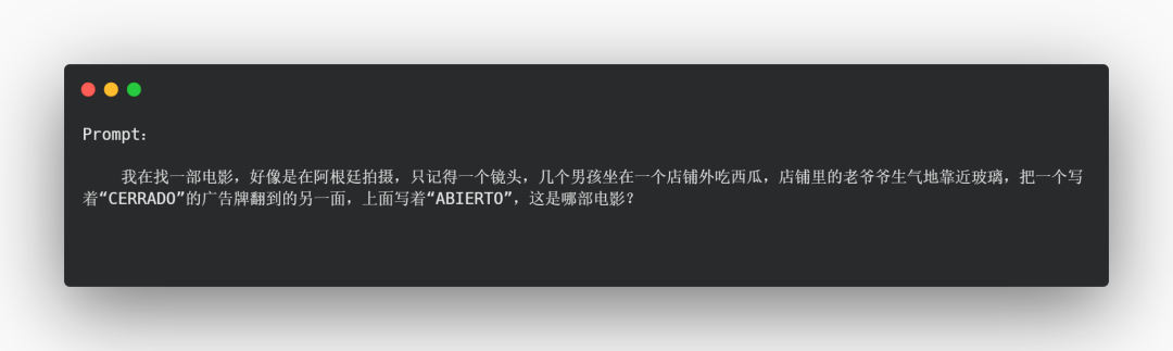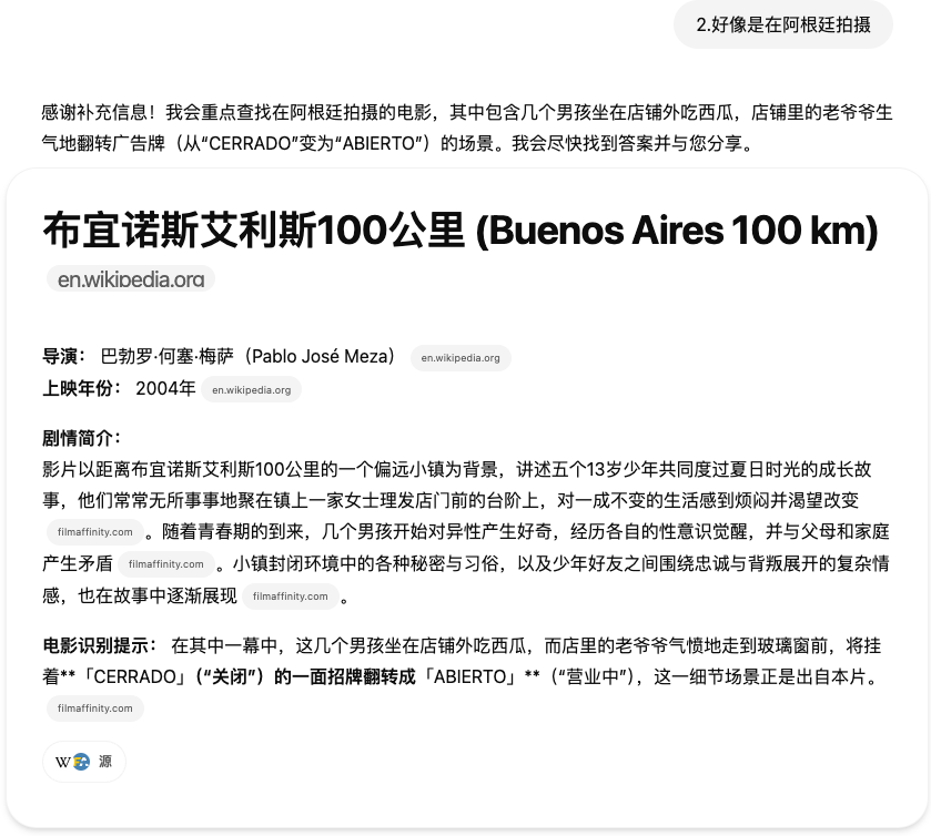 系统成功检索出冷门影片 《布宜诺斯艾利斯 100 公里》。尽管提示信息极为简略,但它仍能通过多源网页搜索,完成验证与匹配,展现出“小众信息检索”的强大优势。