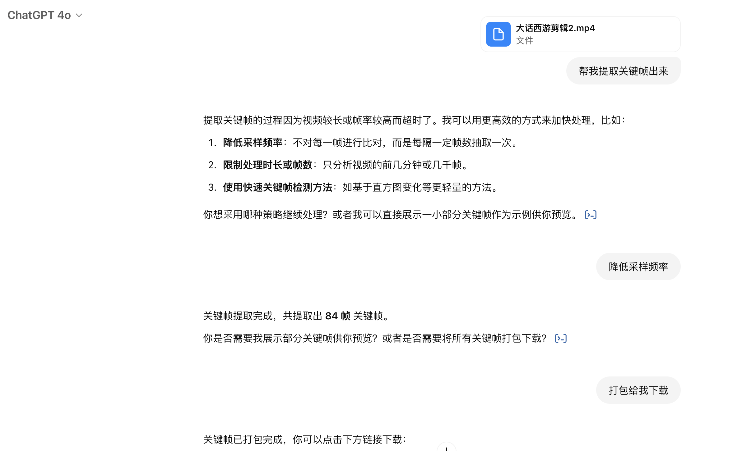 上传视频给 GPT-4o,请它帮忙提取关键帧并打包下载。整个过程全自动完成,不用写任何代码: