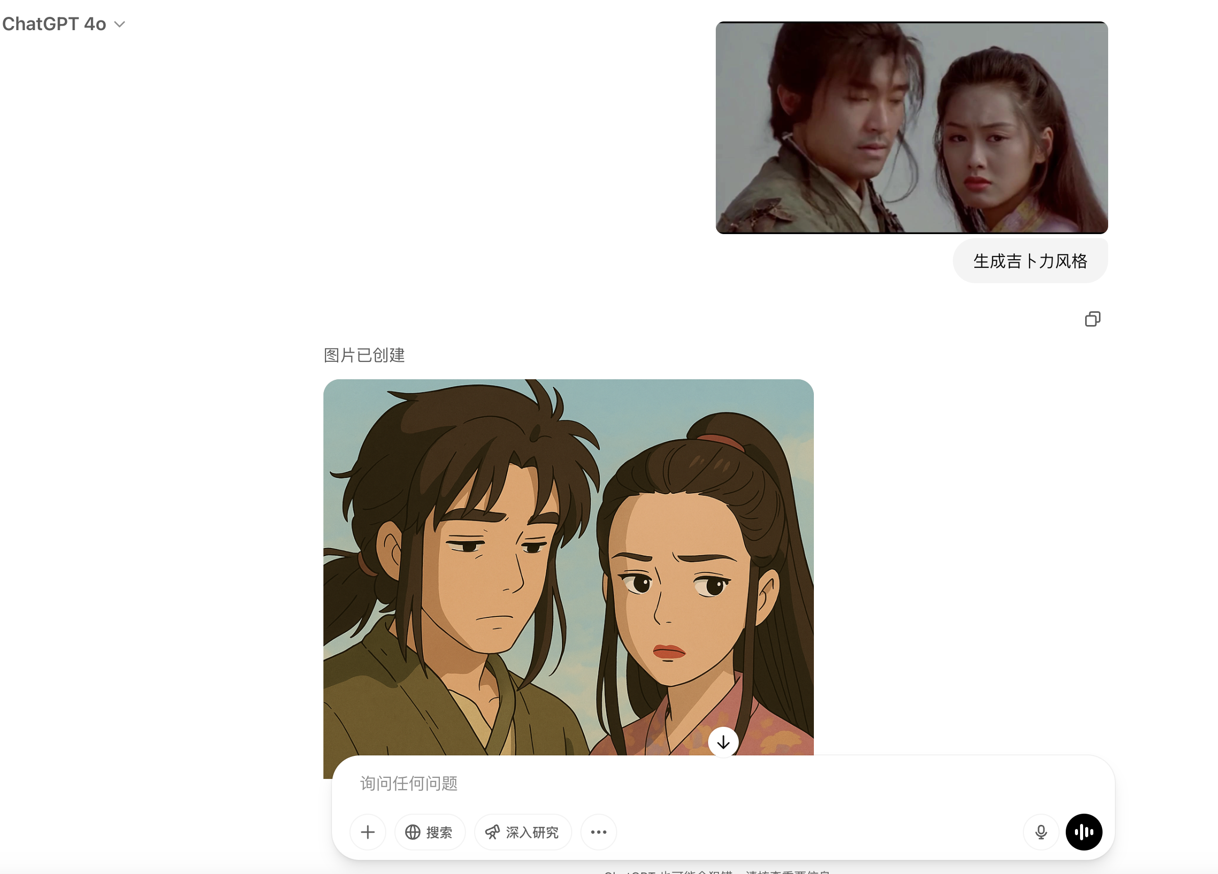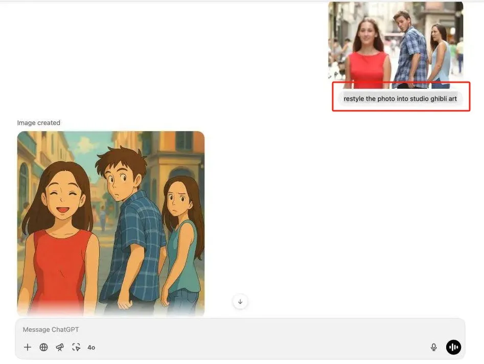 只需上传一张照片,再输入指令 “restyle the photo into Studio Ghibli art”,即可秒生成吉卜力风格作品: