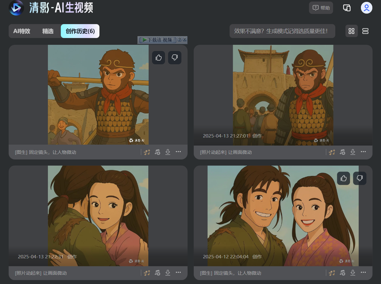 为了让画面“动”起来,可以借助一些现成的免费工具,例如智谱清言、可灵、即梦等,都能让静态图片按照提示动起来。我选择了 智谱,原因是免费且速度不错: