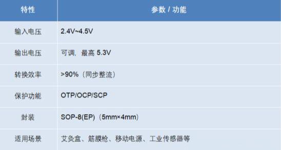 满足加热片需求:输入电压2.4V~4.5V,升压至5V,