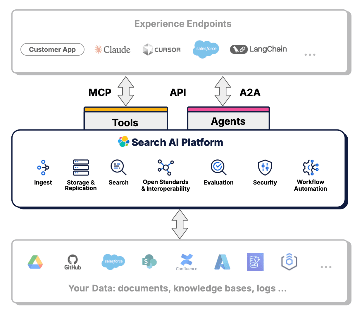 最终目标是交付 AI 体验。依托 Search AI Platform 与您的数据,可构建各种生成式 AI 应用:自定义聊天界面、与 LangChain 等 Agent 框架集成,或嵌入 Salesforce 等业务系统。