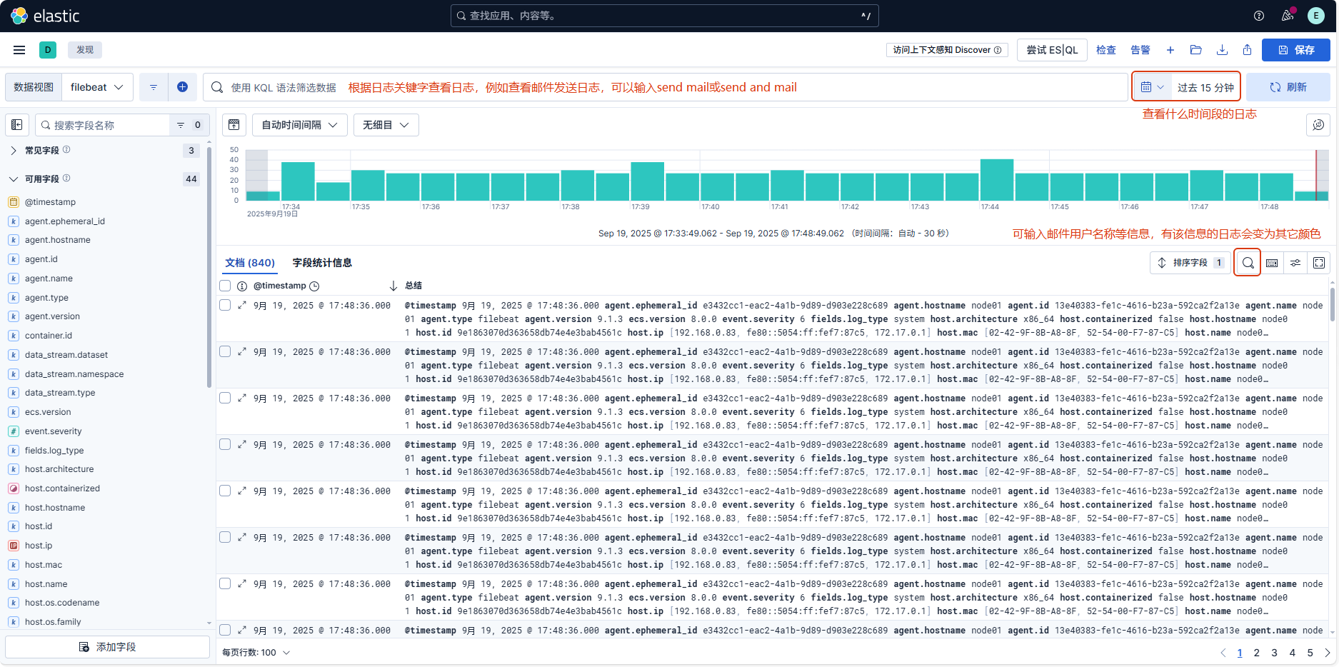 创建数据视图后,就可以看到Syslog的日志加载到Elasticsearch上的效果了,选择Discover查看日志,以查看sendmail日志为例: