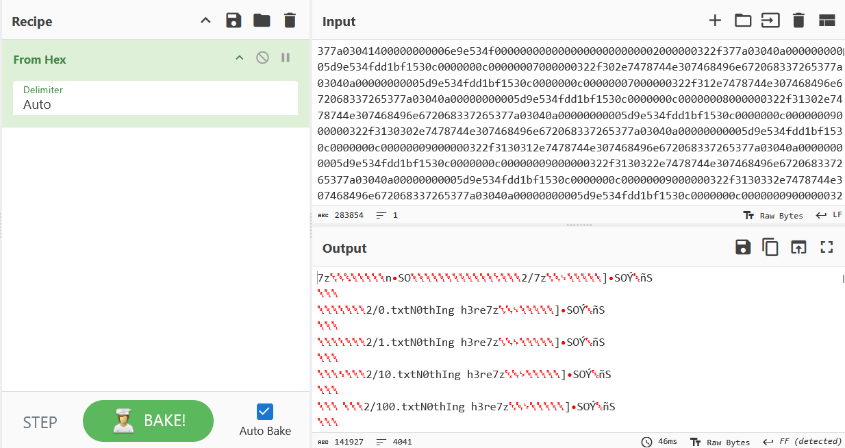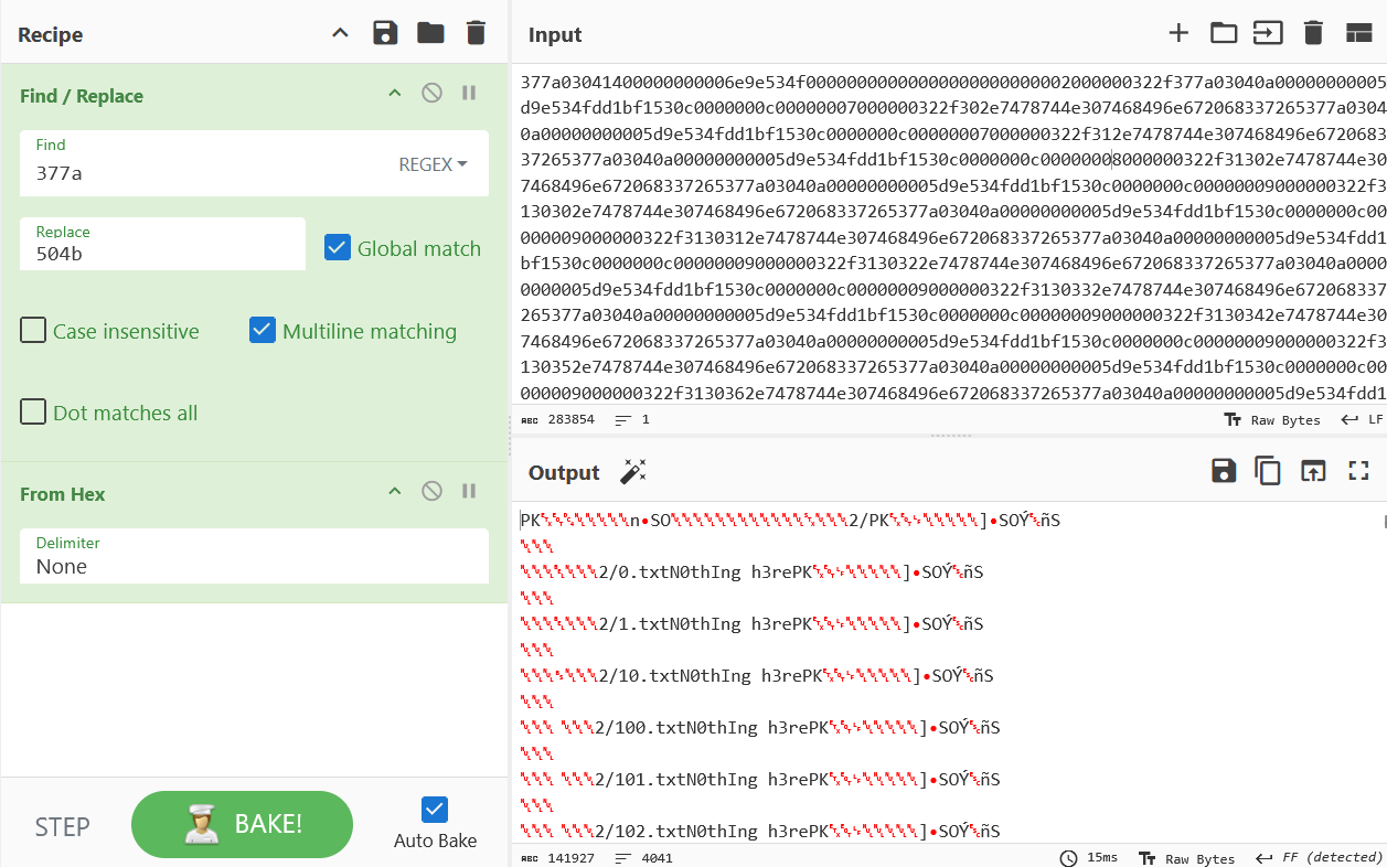 发现开头是7z,但是要注意,这个文件开头“37 7a 03 04”和7z的常规开头“37 7A BC AF 27 1C”差距有点大,反而和ZIP文件开头“50 4b 03 04”很接近,其实就是需要我们把所有7z改为PK。在CyberChef中可以做到一键置换。方法如下: