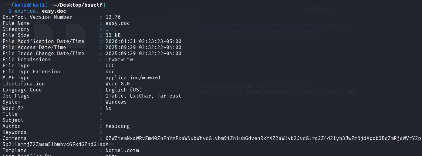 这个直接进行字频分析感觉结果不太对,并且上面提示了有两截,这里找一下另外一部分。通过exiftool查看文档详细信息时发现了一段编辑的评论。这个评论有点像是base64,但是直接解码也什么都没有。