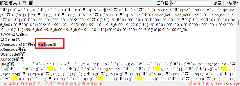 这个一看就是颜文字加密,并且这个文本文件名称是pwd(密码),那应该是用于解密图片的隐写比如steghide。这里用随波逐流工具的一键解码然后找到颜文结果就行。