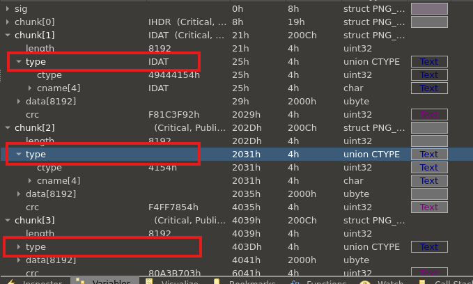 错误显示chunk[2]\[3]\[29]存在问题,29的问题和这道题目没关系也不影响做题,只用看前面的2和3就行,右边展开chunk1、2、3,chunk1是正常的,我们用于比较。这里发现2、3的问题在于type值也就是常说的IDAT值错了,本来表示IDAT的“49 44 41 54”变成了别的值。