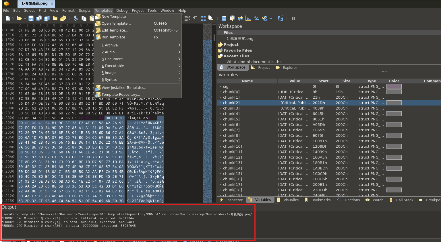可惜输出的图片依然只有其中一部分,怀疑是不单单修改了宽高,还有别的数据被改写了所以显示不出来。这里放进010editor,通过其中的png图片模板具体看是哪部分有问题。进去之后选择上方工具栏中的“Templates” - “Run Template”,工具会自动识别文件为png并运行脚本。这里首先会出现一个错误提示。