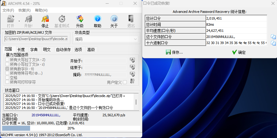 文件夹末尾有一个计算式,通过计算发现前面的结果是7,可惜“7NNULLULL,”并不是密码,应该是7位数字加上"NNULLNULL,",打开ARCHPR用掩码模式进行爆破。
