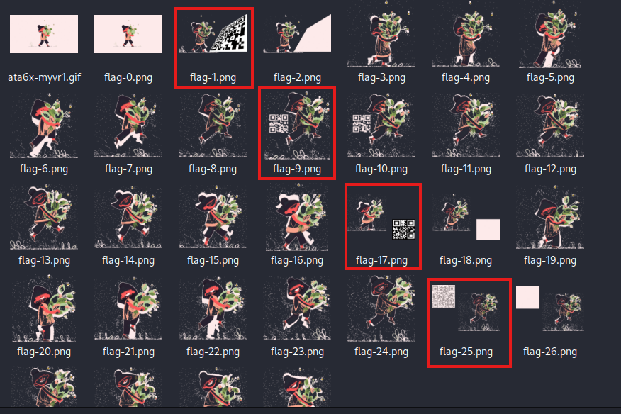 接着就可以用老办法,通过convert工具把gif的所有帧提取出来,然后再把其中二维码部分提取出来进行扫码。另外这里用qr_research工具扫码的效果可能不太好,很明显其中有一张二维码是歪的,而qr_research这个工具往往只能对完整且正的二维码进行扫码,后续的扫码部分我是用的微信扫一扫。