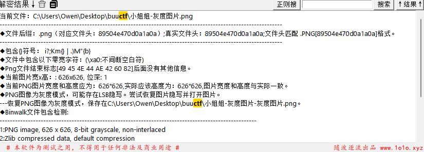 先看图片。放进随波逐流工具里看一下分析结果,结果显示原图是个灰度图片并且输出了一张修复图,但修复图里什么都没有。