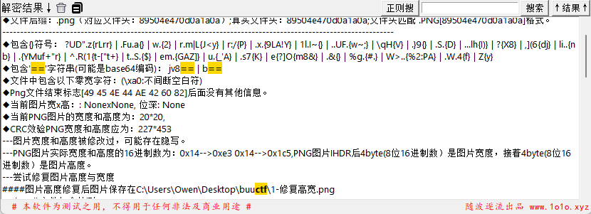 这里简单讲一下每张图正确的思路。第一张图先放进随波逐流工具,显示CRC校验失败,说明被修改了宽高。这里工具也是直接输出修复后的图片。