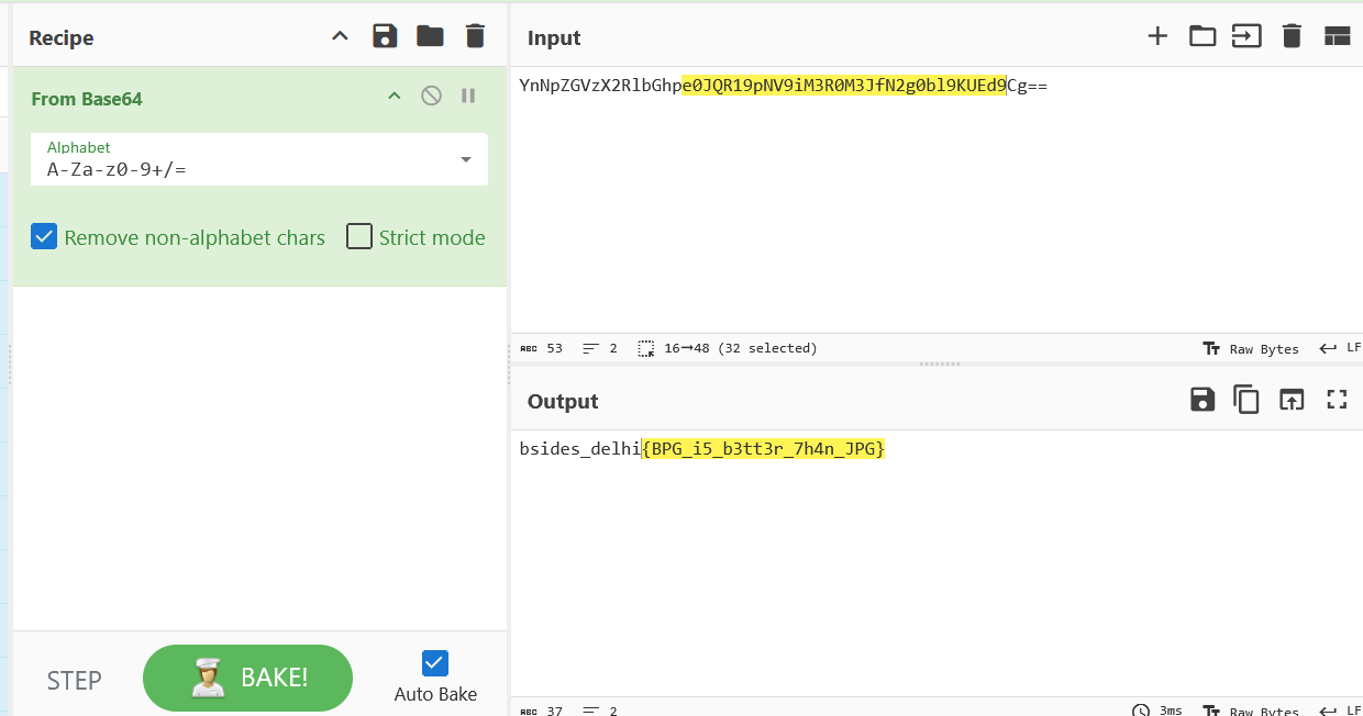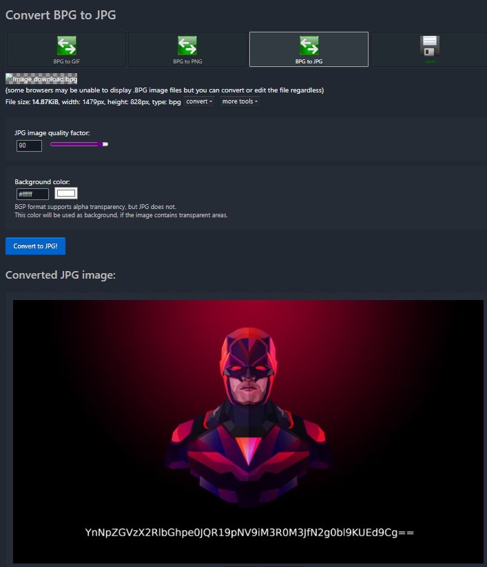 转换之前先把CyberChef转换后的输出以bpg格式结尾保存出来,再上传在线工具中,输出结果的图片中有一串base64编码。我们拷贝出来再进行解码,解出来就是答案。