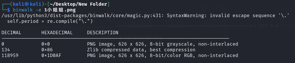 但这里提单灰度图了就想到可能是灰度水印,或者是别的图片通过水印和这张图片通过一些方法合并到了一起比如傅里叶变换。这里用binwalk分离一下,发现分离的输出确实有两个PNG标识。(这里有个报错不用管)