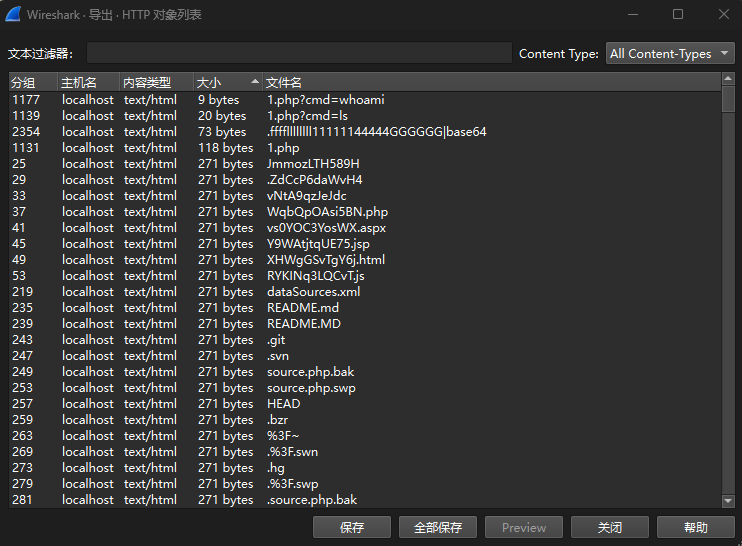 非常简单的日志分析题目。下载日志文件并放进wireshark。因为流量都是TCP以及HTTP的,这里直接通过导出HTTP文件查看请求了哪些文件内容。大部分文件都是404,只有个别是有具体内容的。