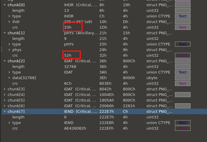 这说明3.png的文件数据是没有问题的因为windows上可以看,但可能图片块的其它标识信息出问题了。反正对于kali来说,一般一点小毛病就没法预览了,但对于我们做题倒算是有帮助。把第三张图片放进010editor,提示crc错误。打开发现每一个chunk0到chunk6的crc都被特殊编辑过,被编辑成了hex格式。这里chunk7是正常的可以参考。