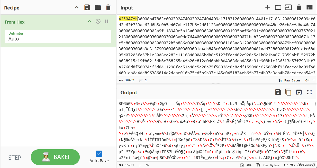 “425047fb”,没见过的文件头,要么是个不常见的文件头,要么是个常见文件头被修改了。把输出的所有末尾hex放进CyberChef并转换为ASCII码,发现开头是BPG。