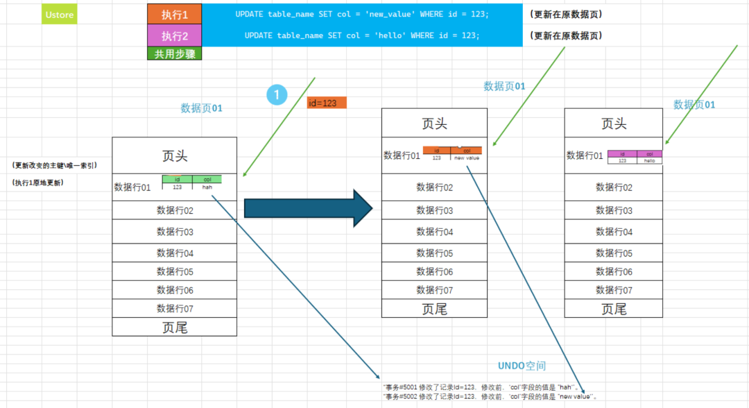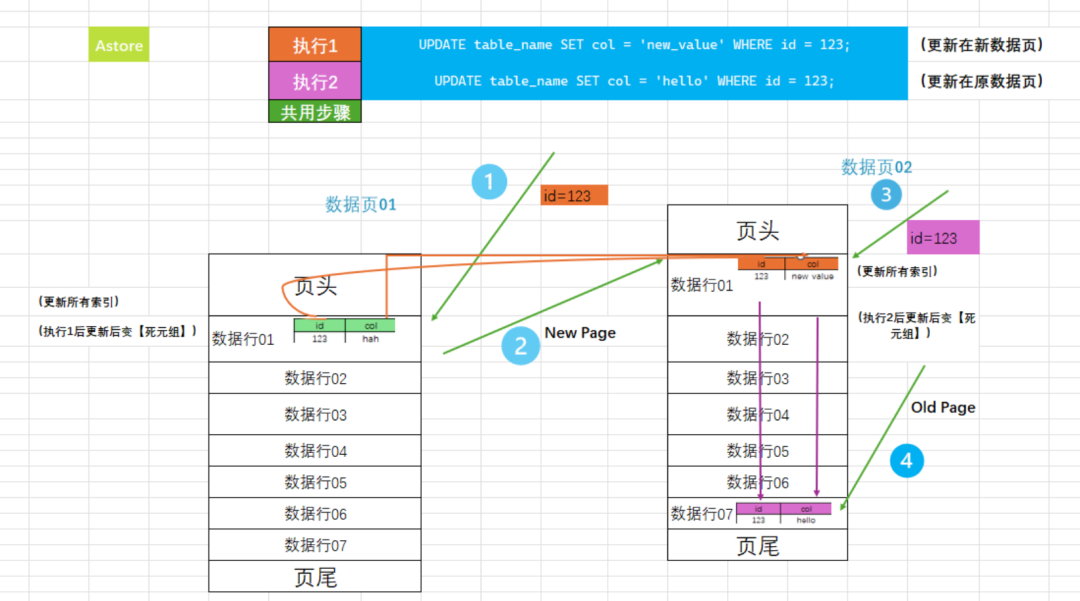 那我们来了解一下他们的区别 ,先来看看Astore~全称是Append Update。首先可以看图中有两个执行更新语句,不同的操作色块代表不同的操作,如执行一是橙色,下图中橙色则为对应的变化,绿色则为公共步骤,执行二以此类推。