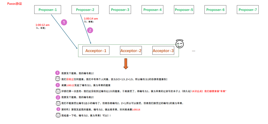 我们代入例子去理解这个协议。如果有三个人要去百度搜索个东西,分别是Proposer-1、Proposer-2、Proposer-3,我们可以看到紫色圆圈步骤1,是P1(Proposer-1缩写)发话了:我要发个提案,编号为1。P1这句话发给分布式节点,大家一合计,我们也没收到其它的比编号为1还大的,我们三个节点有两个节点都同意,超过一半了,你发出来吧。P1就拥有提案权了,它在凌晨1:00:12发起编号为1,值为苹果的提案。分布式节点们正式收到P1的提案了,它们又一合计,我们还没收到编号比1大的提案,于是正式接受了编号为1,值为苹果的记录,而且偷偷写在本子上(持久化数据)。
