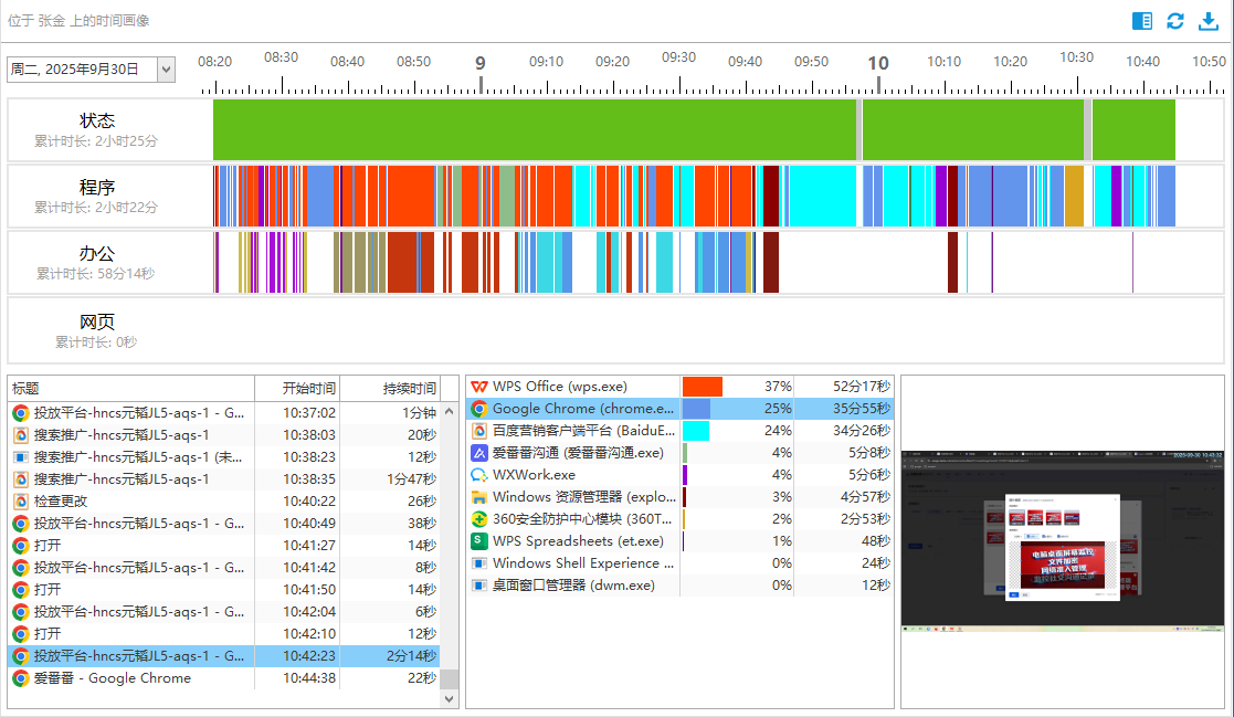 软件独创的“时间画像”功能,基于屏幕活动、程序使用、网络访问等多维数据,自动生成每位员工的数字化行为画像,如办公时长、网页时长、程序时长等信息。
