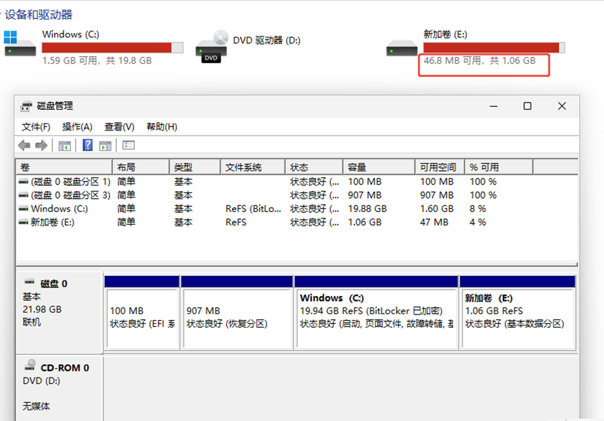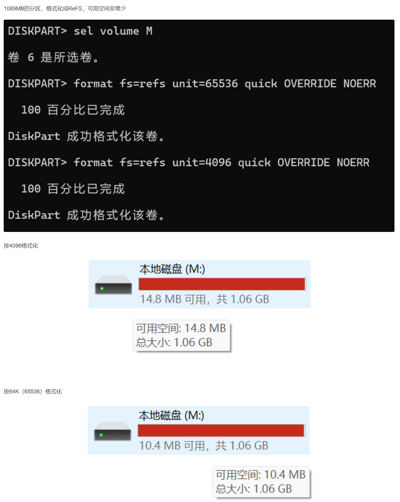 1089MB的分区,用ReFS格式化后,可用空间只有两位数MB(为啥有的是40多M,有的是十几M,我没搞懂)
