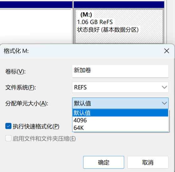 给的截图是 Windows 的格式化对话框。ReFS 的“分配单元大小”(cluster size)只有两个可选:4096(4K)和 65536(64K)。这是正常现象,不像 NTFS 那样提供更多档位。
