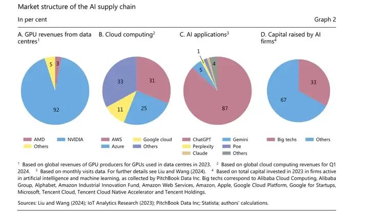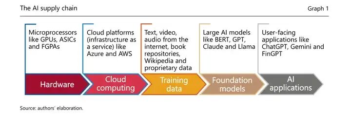 国际清算银行(BIS)2025 年报告指出,AI 发展依赖由硬件、云基础设施、训练数据、基础模型、AI 应用构成的复杂供应链,各层级市场结构差异显著