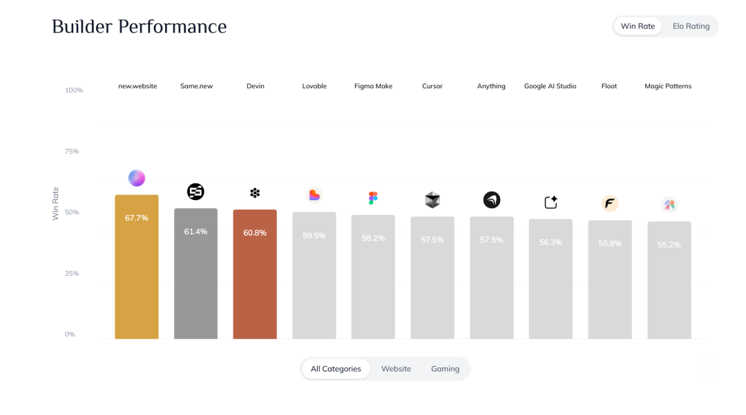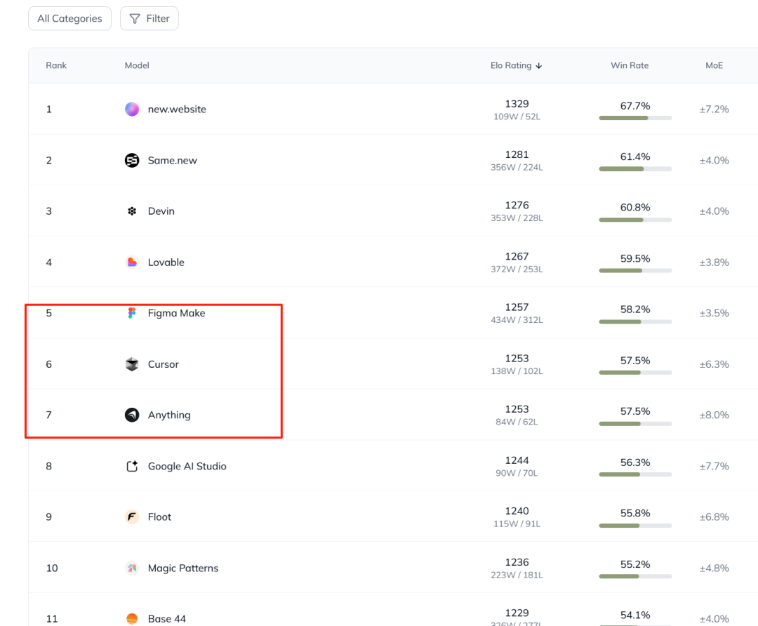 这里是所有参与评测的构建器的榜单。有Cursor、Devin等,emmm,感觉V0的名次低了些(可能V0最近更新的模型也没用上)