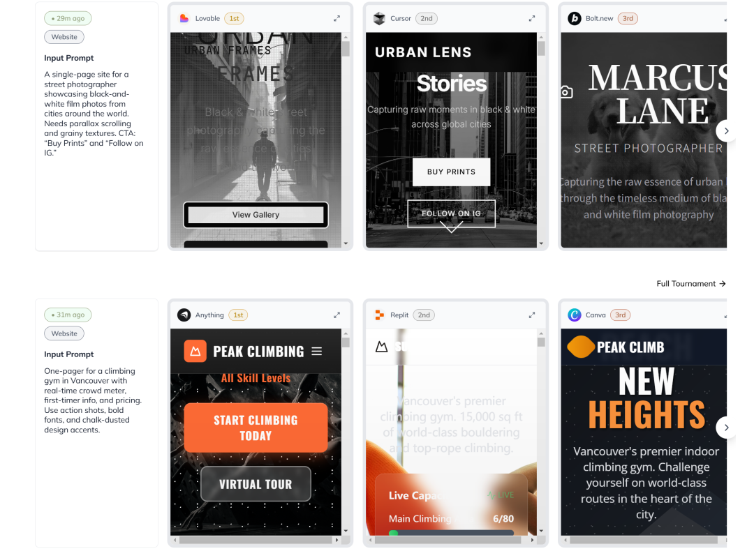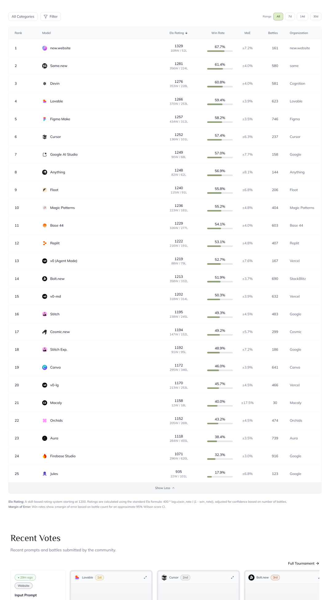 昨天了解到这个Design Arena评测平台也是感觉挺有意思。因为它有一个其他排行榜没有的东西,它就是对这些氛围编码构建器进行了排行。